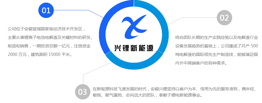 興鋰新能源,是一家專業(yè)從事鋰離子電池電解液及相關(guān)材料的研發(fā)、生產(chǎn)、銷售與服務的高新技術(shù)企業(yè),目前擁有安徽宣城和貴州凱里兩個生產(chǎn)基地。公司主要生產(chǎn)鋰離子電池電解液,產(chǎn)品被廣泛應用于電動汽車、電動自行車、電動工具、儲能、3C數(shù)碼電子等各個領(lǐng)域。公司目前正在研究開發(fā)的項目包括匹配高鎳正極的電解液、匹配硅碳負極的電解液和固態(tài)電解質(zhì)。憑借技術(shù)和成本優(yōu)勢、良好的品質(zhì)以及售后服務,在廣大客戶中贏得良好的口碑。公司團隊具有十余年專業(yè)從事鋰電材料研究開發(fā)、工藝優(yōu)化、營銷服務的經(jīng)驗,具有豐富的一線生產(chǎn)、工程設備管理經(jīng)驗,具有過硬的質(zhì)量保證與問題解決能力,具有創(chuàng)新的服務意識。先進的管理理念,精良的工藝裝備,高素質(zhì)的員工隊伍,較高的生產(chǎn)效率,較低的生產(chǎn)成本,把客戶的需求落實到生產(chǎn)流程的每一個環(huán)節(jié)。公司高度重視科技創(chuàng)新...